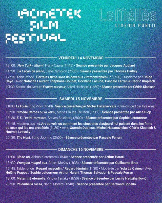 LaCinetek, une plateforme indépendante, sans actionnaire ni dividende, dont les seules missions sont de transmettre et de partager notre amour du cinéma, fête ses 10 ans ! En collaboration avec le Méliès de Montreuil, qui célèbre lui aussi les 10 ans de son complexe art et essai de six salles, nous organisons un festival du 14 au 16 novembre 2025 pour fêter cet anniversaire commun. Trois jours de projections, de tables rondes et d'échanges pendant lesquels des cinéastes associés à LaCinetek viendront partager avec vous l'un de leurs films préférés ; un rendez-vous festif qui se veut à l’image du site : amical et arborescent, pour redécouvrir, tous ensemble, des œuvres aimées sur grand écran.